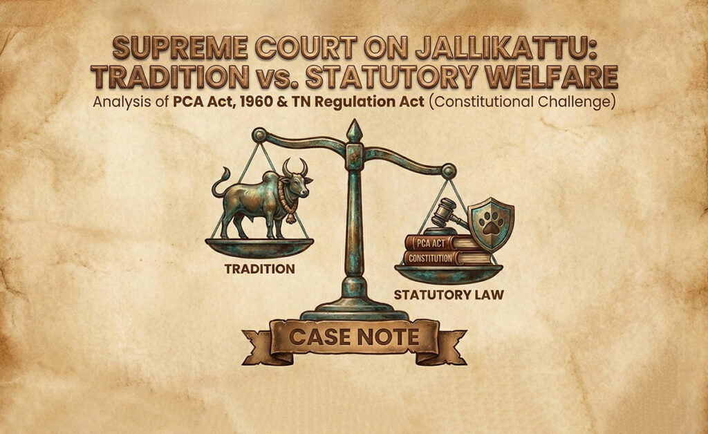 Issue(s) Whether events like Jallikattu, bullock-cart races, etc. violate the provisions of the Prevention of Cruelty to Animals Act, 1960 (PCA Act), in particular Sections 3 and 11. Whether the Tamil Nadu Regulation of Jallikattu Act, 2009 (TNRJ Act) is constitutionally valid or repugnant to the PCA Act. Whether the rights under Sections 3 and […]